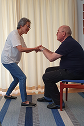 - 相手と自分の足の位置を整え、しっかり構えて上半身を一緒に前傾させ、二人でダンスをするような感じで手を前方→上方へと動かしながら、一緒に立ち上がります。