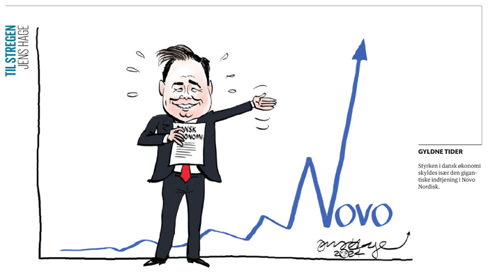 現在デンマーク経済は順調な伸びを示していますが、その主な要因は、医薬品の輸出が非常に好調であるためだといわれており、次のような風刺画まで登場しました。